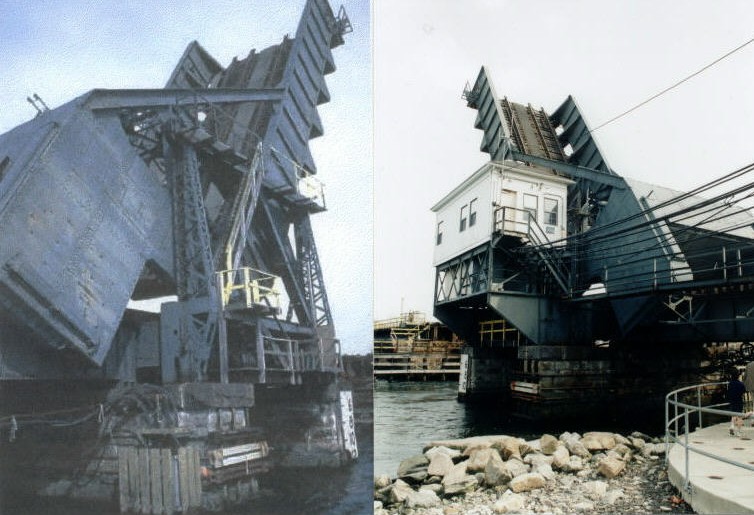 In 1897, the company was contracted to build a turntable swing bridge across the Danvers River between Beverly and Salem to replace an earlier structure. This was a 122- foot, rim-earing Warren pony truss that was designed to carry street cars as well as other surface vehicles. Known as the Essex Bridge, it was one of the oldest of the sate’s movable bridges and was extensively repaired over the years until it was replaced in 1997 by a long span structure after a long period of agitation by the local community.[5] One of the most remarkable of the King movable bridges is “Old Nan” across the Niantic River between Niantic and Waterford, Connecticut. It is the oldest of five movable bridges still operating on the rail line between Boston and New York and used daily by Amtrak’s Acela high-speed trains. It consists of four fixed-deck girder spans plus a 69 foot center span which is a Scherzer bascule. The bridge was built in 1907 and has been in continuous operation ever since. It has been documented in the Historic American Engineering Record, archived in the Library of Congress, and still has both the builder’s plates of the King Bridge Company and the Scherzer Rolling Lift Bridge Company. With the desire of Amtrak to increase the operation of high-speed trains up to at least 35 per day, the prospect of keeping this bridge in operation is limited. While in the winter it is seldom opened to let boats through, in the summer there is a considerable amount of boat traffic in and out of the river requiring quite a bit of movement from the old gears and engines that need constant maintenance. Replacement solutions are still being studied and most will require removing the old bridge, which while not very elegant in appearance, represents a living example of a fine old engineering technology.