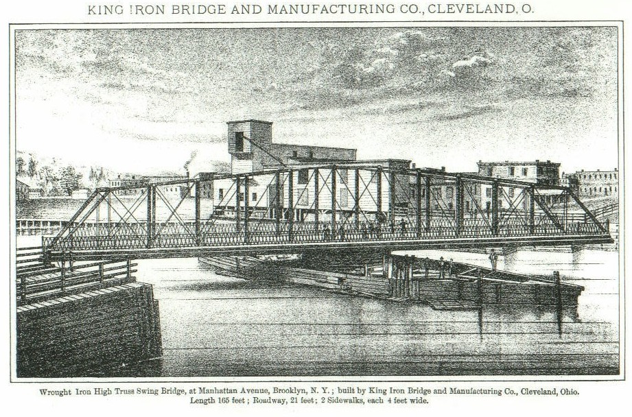 As early as 1874, the King Bridge Company was selected to build the Grand Street Bridge in Eastern Brooklyn across Newtown Creek. This was a drawbridge built for $18,200 and was in service for fifteen years but suffered from poor maintenance. The company bid on its replacement in 1888 but lost out to a local contractor. However, the company did display one of its New York moveable bridges in its catalogues of the 1880s. This was a 168-foot wrought iron high-truss swing bridge on Manhattan Avenue in the Greenport section of Brooklyn. This bridge also has long since disappeared.