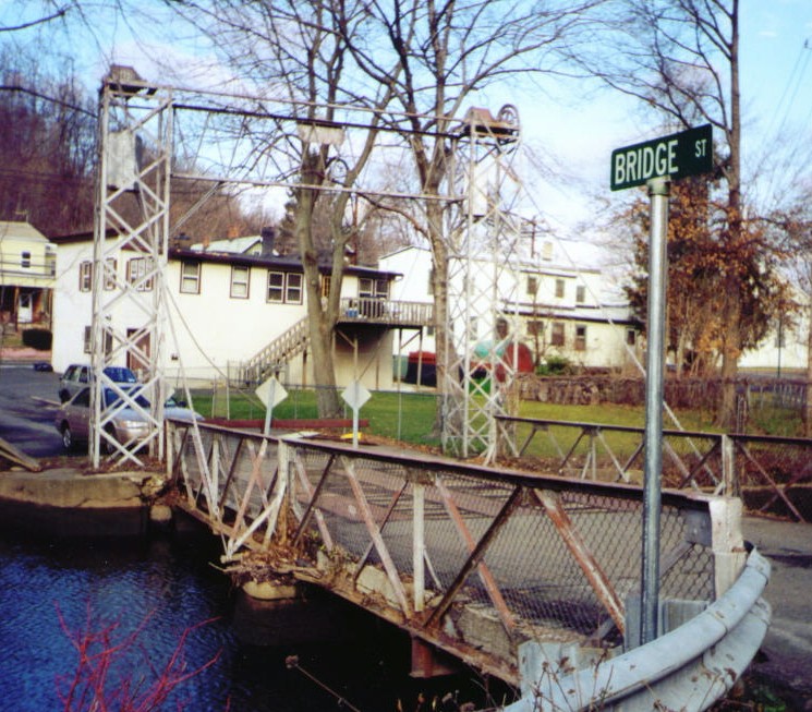 There are two other King-built moveable bridge still standing in the Metropolitan New York Region. The first is the Old “New Bridge” crossing the Hackensack River in River Edge, New Jersey, not far from the George Washington Bridge, at the site of the Steuben House historical center. This is a Pratt low-truss swing bridge built by the company in 1889 using channel iron furnished by its sometimes rival, the Phoenix Bridge Company of Pennsylvania. It is the oldest such structure in New Jersey and has recently been refurbished by Bergen County. It is listed on the National Register of Historic Places. The second is farther north in Rockland County, New York, at Piermont on the Hudson River. This is a small lift bridge across a narrow canal that once was used for barge traffic. It was built in 1890 and is used now only for bicycle and pedestrian traffic, but it still has its superstructure and lifting mechanism in tact, along with a prominently displayed builder’s plate.