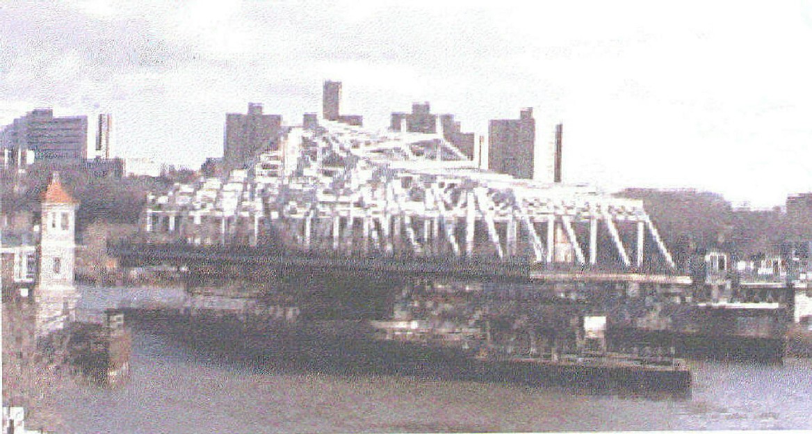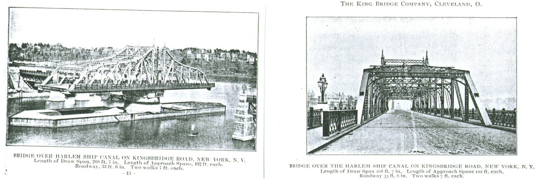The records and bridge literature of New York City credits the design of the original ship canal bridge to three noted engineers and bridge designers, William Burr, consulting engineer to the City Department of Public Works, George Birdsall, chief engineer of the department, and Alfred P. Boller, the designer of this and other movable Harlem River bridges. The contractor for the bridge was listed as A. McMullen & Co., a company not listed among the major bridge builders of the time[4]. It could be that McMullen was acting as agent for a number of sub-contractors hired to build the bridge including the King Bridge Company. As yet no mention has been found of the King Bridge Company as the builder of the original structure, but the search is on-going.