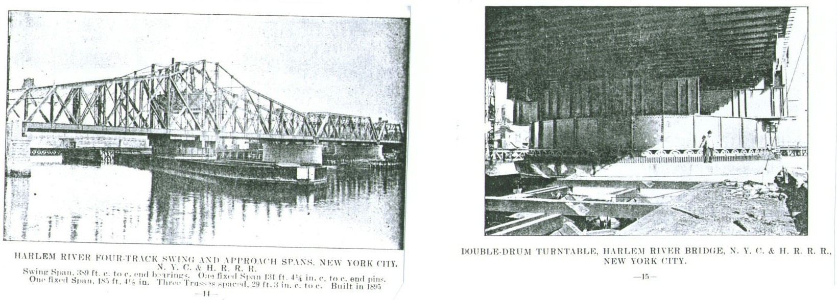 In the 1890s company catalogues, there are two notable swing bridges pictured across the Harlem River: first a three-span bridge with a center movable span of 268 feet across the Harlem Ship Canal at Knightsbridge Road; and the second, a four-track swing bridge built for the New York Central and Harlem River Railroad. Both were built in 1895. The railroad bridge had two fixed spans of 185 and 134 feet respectively and a central swing span of 389 feet mounted on a massive double drum turntable. It had replaced a 1860s fixed span bridge and was replaced in turn in 1954 by a lift bridge still operating today on one of the nation’s most important rail lines.[3]