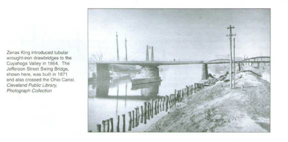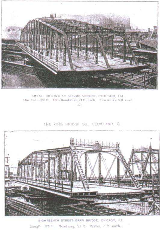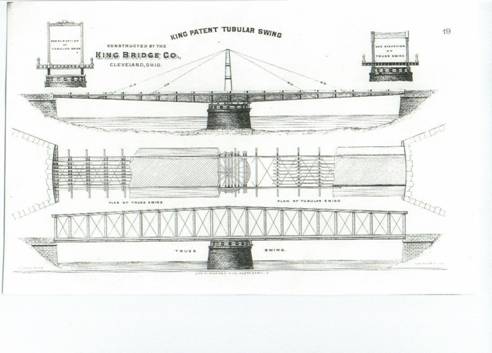 MICHIGAN-ILLINOIS-INDIANA In an old King family photo album, there is a remarkably clear picture of a high truss bowstring bridge mounted on a large turntable in Manistee, Michigan on the eastern shore of Lake Michigan. While there is no reference to this bridge in the company catalogues, it is probably one of the earliest of the movable bridges built by the company combining the designs of the two bridge patents Zenas secured in the 1860s. The Company was an active participant in the bridge-building boom in the states bordering its Ohio home, particularly for the railroads. Two of these are of particular note.