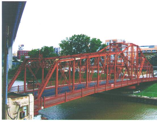 One other King swing bridge built in the Chicago area was pictured in the 1890s company catalogues, a double track railroad span of 210 feet across the Calumet River in South Chicago. It was constructed for the ILL, L.S. & M.S. R.R. to serve the steel mills and was still in operation in the 1960s. Its fate since then is not known, but its design was replicated in the Hojack Swing Bridge that is still standing in the Genesee River in Rochester, New York (see below).