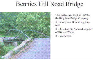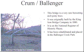 1. Historic Bridges of Frederick County, Maryland (http://www.co.frederick.md.us/transportation/documents/historic) In addition to the Bennies Hill Road bowstring reported on in our 2004 update, there is another King bowstring in Ballenger Creek Park as shown below.