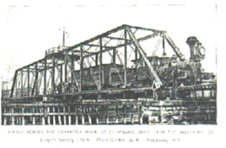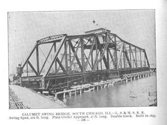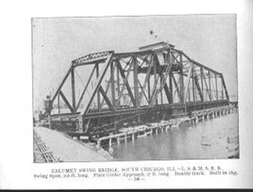 drowning.[2] Since many railroads ran in alignments at the same elevation as rivers and canals, swing bridges provided the easiest way to cross these watercourses without blocking navigation channels. This was before the advent of bascule and lift bridges. The 210 foot double track swing bridge pictured below is an example an important product of the King Bridge Company. It was built in 1895 across the Calumet River in South Chicago, Illinois and was in operation for many years in an area with heavy volumes of rail traffic.