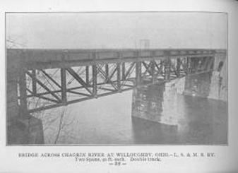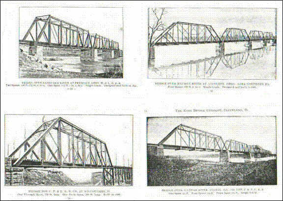 Three of the four through truss bridges pictured above were built in 1896 for railroads in northern Ohio. The multi-span structures were built across the Sandusky River at Fremont, the Maumee River at Napoleon, and the single span across Chagrin River at Willoughby The bridge in the lower right frame had five spans with a 300 foot swing span in the center. It was built for the P.& P.U. Railroad and crossed the Illinois River at Peoria.