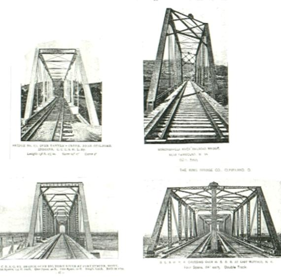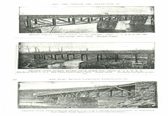 THE CATALOGUE BRIDGES The sales catalogues of the 1880s and 1890s featured a wide variety of bridges built for railroad companies. Most were located in the states of Ohio, New York, Pennsylvania, West Virginia, Indiana, and Illinois, but some were located as far west as Iowa and Montana. The pictures below have been copied from these old catalogues.