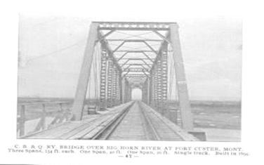 The picture on the right, sent to us by Stephen Taylor of Austin Texas, is a standard through truss bridge originally built for the Texas Central Railroad in 1906 near Clariette, Erath County, Texas. It is still standing today and the original rail bed was converted to a county road. It sill has its King Bridge Company plate hidden behind the leaves on the right side end post. The bridge very closely resembles the railway bridge on the left pictured in the company catalogues of the 1890s, which crossed the Big Horn River at Fort Custer, Montana and is no longer in existence.