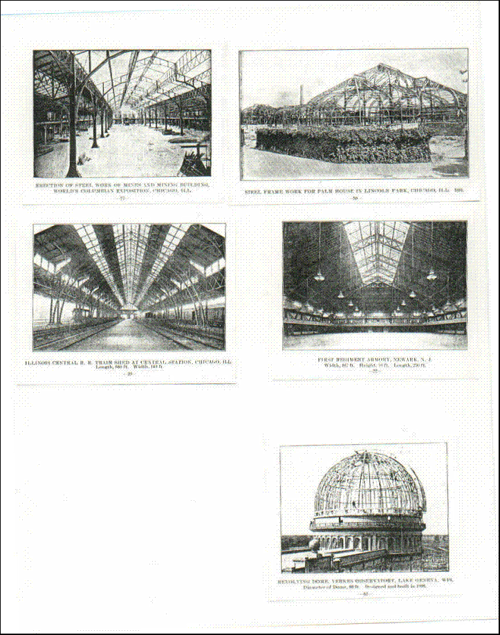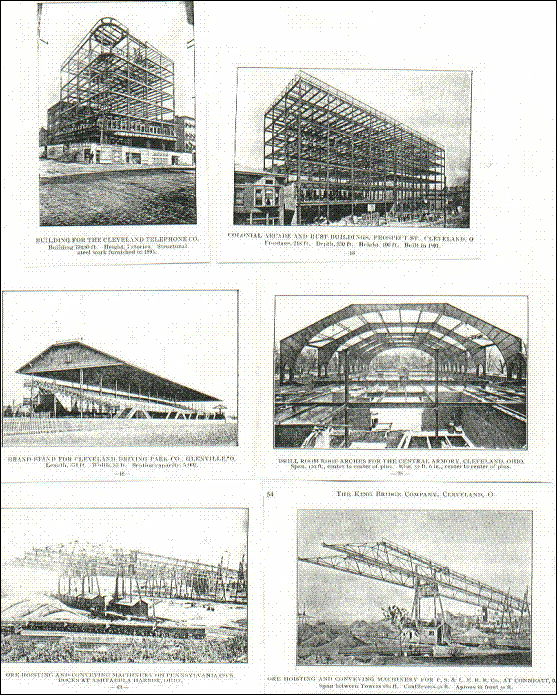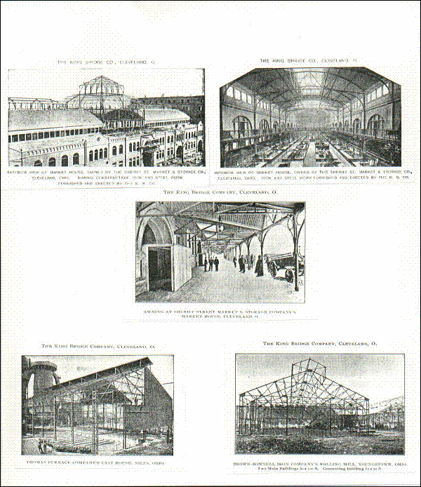 STRUCTURES BUILT BY THE KING BRIDGE COMPANY By Allan King Sloan In the late 1900s the independent bridge companies were under pressure to keep up not only with the evolving technology in the use of steel for structures other than bridges but also to respond to the aggressive moves by the great business tycoon of the era, ( in particular J.P. Morgan, Andrew Carnegie, Charles Schwab and Elbert Gary, the founders of the United States Steel Company, who were in the process of buying up the bridge companies in order to monopolize the bridge-building industry). Apparently part of the response of the King Bridge Company, in addition to its refusal to be bought out by the American Bridge Company, U.S. Steel’s proxy, was to get itself into the business of erecting non-bridge steel structures. The company catalogues of the 1890s featured a number of buildings for which the company did the steel work which are pictured below. These included office buildings, shopping arcades, grandstands, armories, covered markets, factory buildings, train sheds, exhibition halls, and even an observatory dome. These were built mostly in Northern Ohio, the company’s base, and in Chicago, where the company’s reputation was strong. The catalogue pictures include the following: In Cleveland